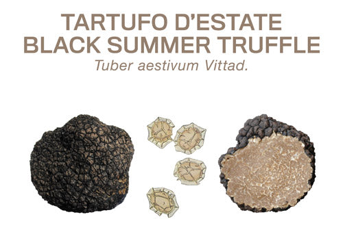 Il Tartufo Estivo è di colore nero-bluastro e ha una buccia molto spiegazzata e spessa, formata da innumerevoli piccole verruche piramidali. Nella sua parte interna il Tartufo Estivo è di colore bruno (dal marrone chiaro al nocciola, a seconda della pianta e del territorio di provenienza) ed è attraversato da caratteristiche venature chiare. È un tartufo di consistenza dura al tatto, meno delicato da maneggiare rispetto alle altre varietà di tartufo, con una shelf life più lunga rispetto al Tartufo Bianco (il Tartufo Estivo fresco può durare fino a 15 giorni dopo la raccolta).