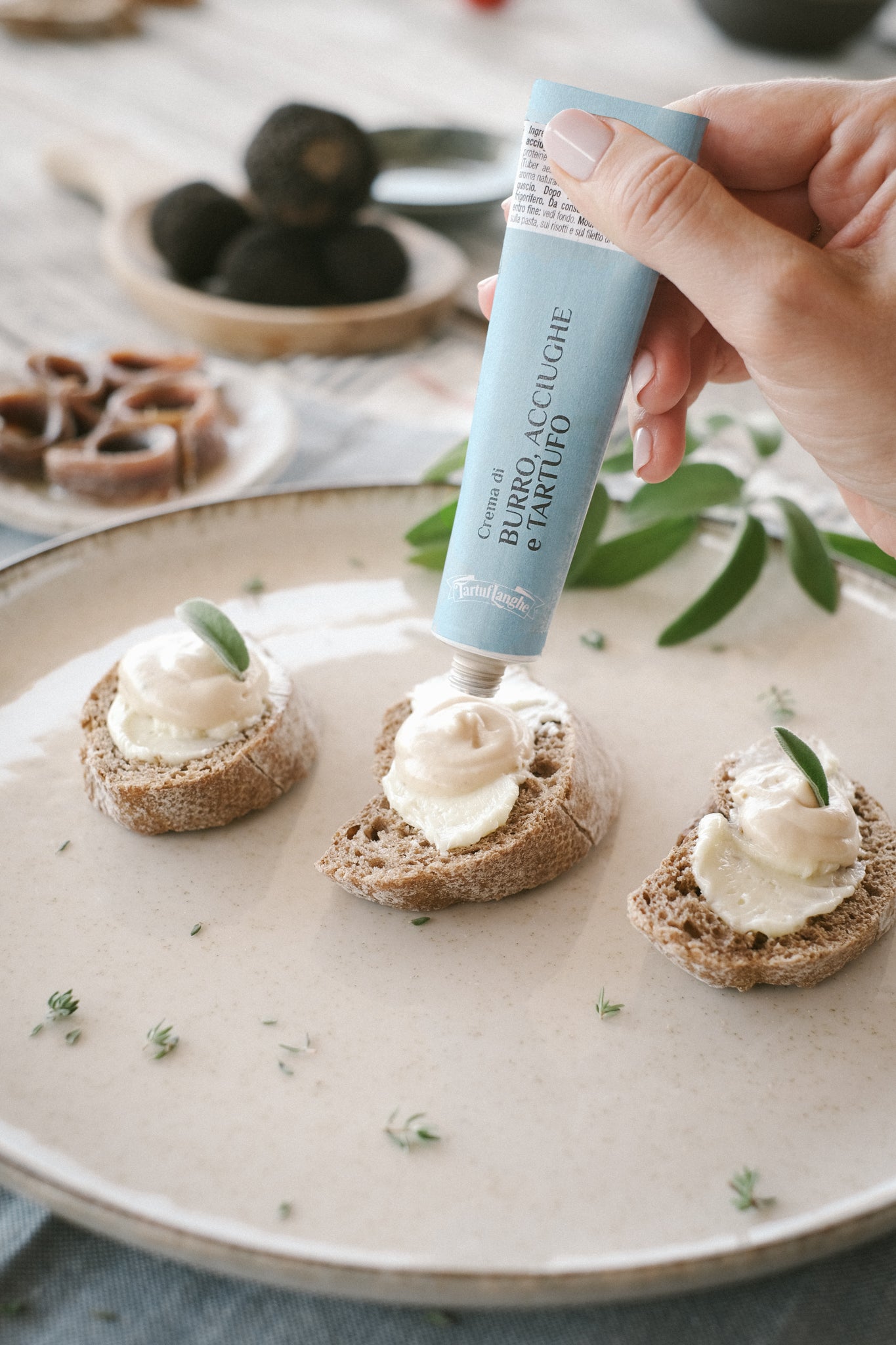 Crostini with butter cream, anchovies, and truffle: a fresh and delicious aperitif.