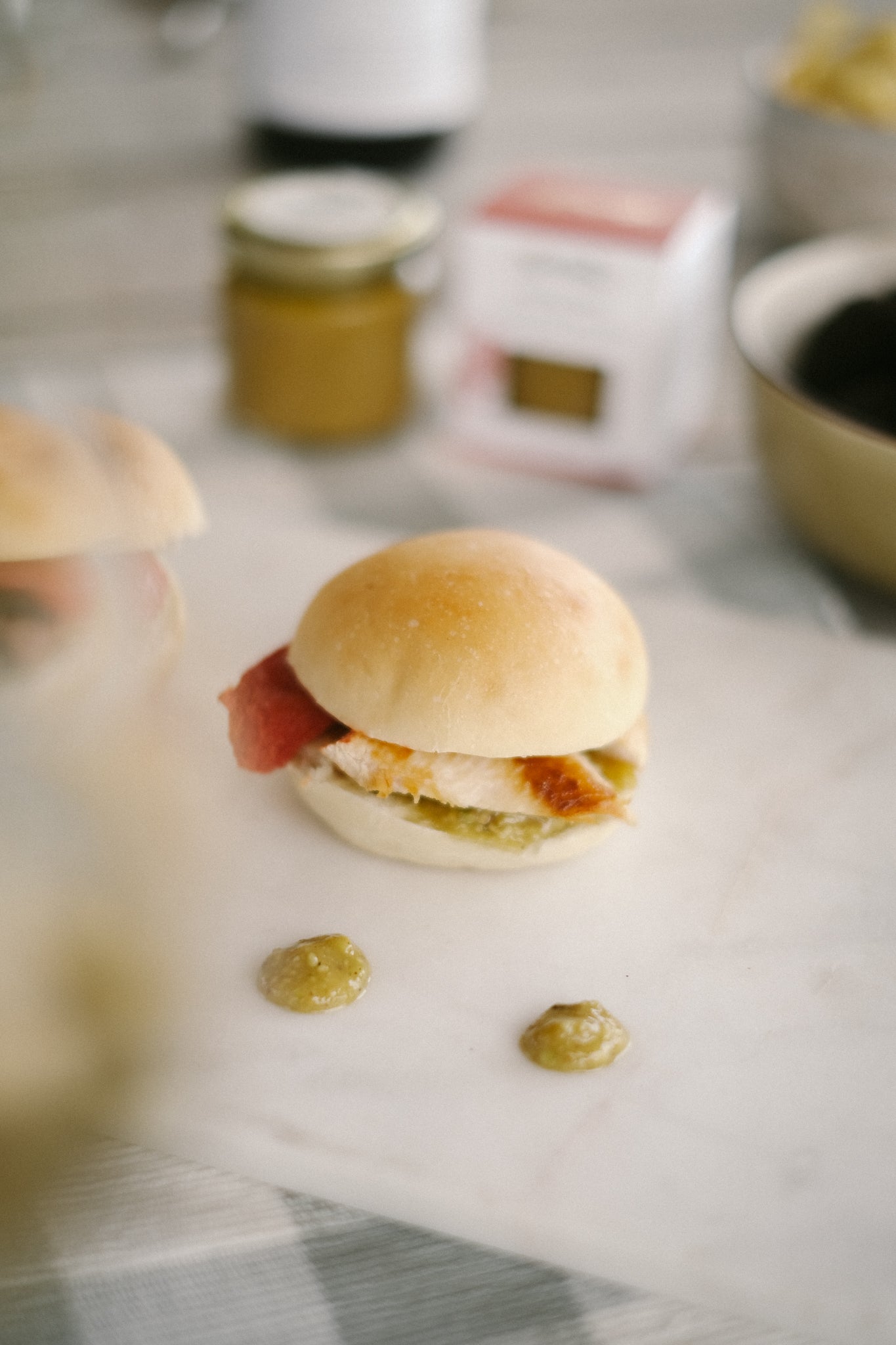 Mini Chicken Burgers with Confit Cherry Tomatoes and Pistachio and Truffle Pesto