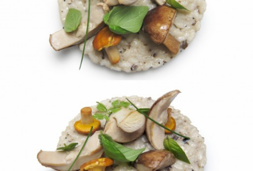 Slice the porcini mushrooms and sauté them in a pan with butter and oil. Clean the chanterelle stems and add both mushrooms to the creamed risotto. Plate and serve hot.