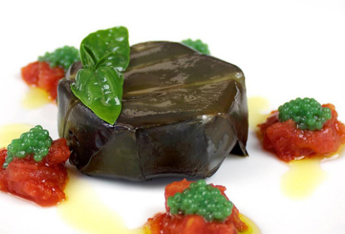 Peel the eggplant and blanch the skin in salted water. Cut the remaining eggplant into chunks and sauté in a pan. Make a béchamel sauce with butter, flour, and milk. Add the eggplant and blend. Once the mixture has cooled, add the eggs. Butter round molds, line them with the eggplant skin, fill them with the flan mixture, and bake in a preheated oven at 160°C (320°F) in a bain-marie for 45 minutes. Heat the tomato sauce, unmold the flans, and serve with a drizzle of pesto.